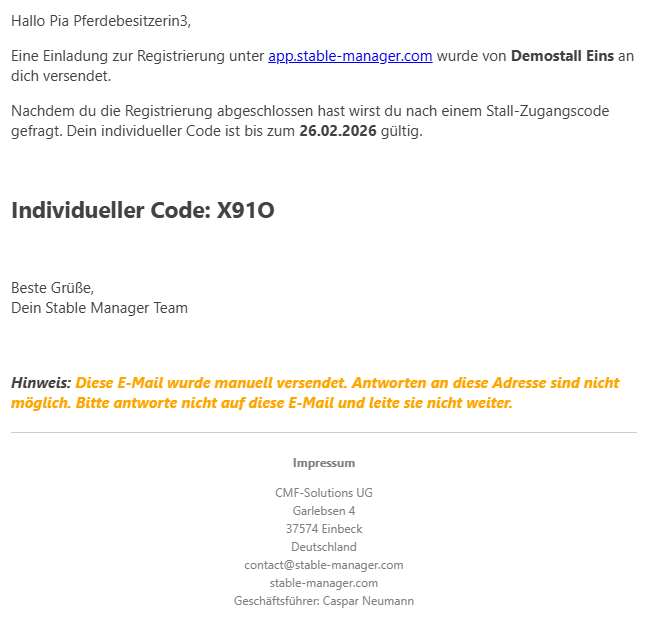 Wenn dein Stallbetreiber sich für die Nutzung des Stable Managers entschieden hat, wirst du über eine Mail wie im Bild eingeladen, dem Stall beizutreten. Folge dem markierten Link, um mit der Registrierung zu beginnen.